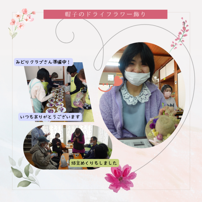 2月のコミュニティサロンみなみは、みどりクラブさんと一緒に「帽子のドライフラワー飾り」を行いました。